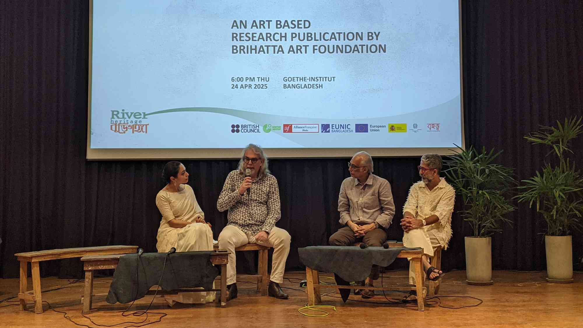 The River Heritage Project_গঙ্গাবুড়ি / Gangaburi is supported by the British Council. An evolution and expansion from previous year’s collective work (2023), ‘গঙ্গাবুড়ি / Gangaburi—the river heritage project,’ has been supported by EUNIC (the European National Institutes for Culture) Bangladesh: the British Council in Bangladesh, Alliance Francaise de Dhaka, Goethe-Institut Bangladesh, EU Delegation in Bangladesh, Embassy of the Netherlands in Bangladesh, and Embassy of Spain in Bangladesh. The title of this project is inspired by the song “Gangaburi” by Kafil Ahmed. The project is directed by Bishwajit Goswami and curated by Shehzad Chowdhury.