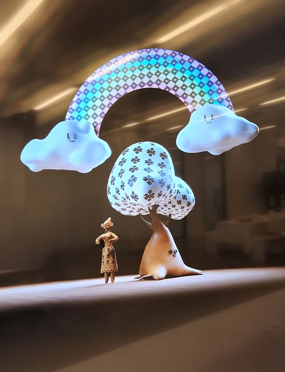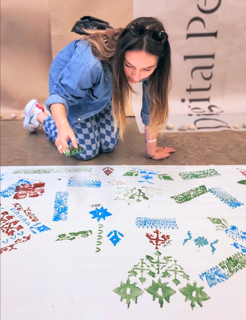Under the creative direction of Bishwajit Goswami, twelve Jamdani block motifs—hand-carved from locally sourced gamari and mango wood—were created using traditional designs reflecting Bangladesh’s rich textile heritage. The motifs, passed down through generations of master weavers, reference the natural and botanical landscapes of the region. Pigment colours symbolized elements of nature: brown for earth, green for vegetation, and blue for water. Three event-specific 3D characters—Tepa Putul, Tree, and Rainbow—were developed by digital artist Ashrafia Rumman Adib for augmented reality (AR). Visitors could digitise their block artworks, map them onto the 3D characters, and experience their creations in AR. Participants were also guided virtually by artisan Subodh Kumar Pal to make their own Tepa Putul out of clay. This blend of craft and digital technology bridged physical and virtual perception for the audience.