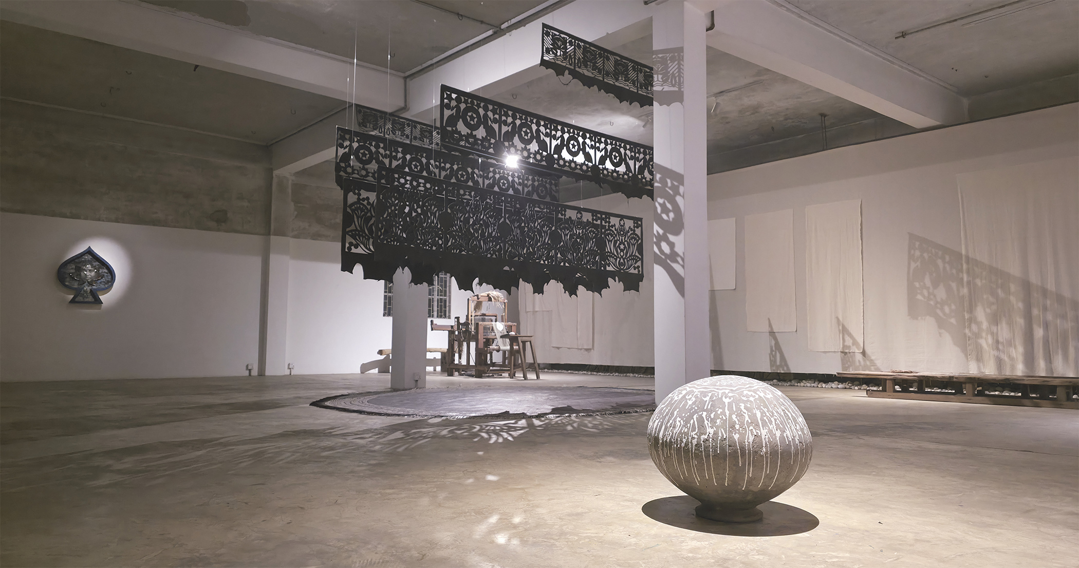 Keya’s The Spell Song translates Khona’s bochon (folk proverbs composed by the medieval astrologer) into a text-based sot sculpture, created from Tangail sarees, reviving feminist knowledge through voice, language, and material.