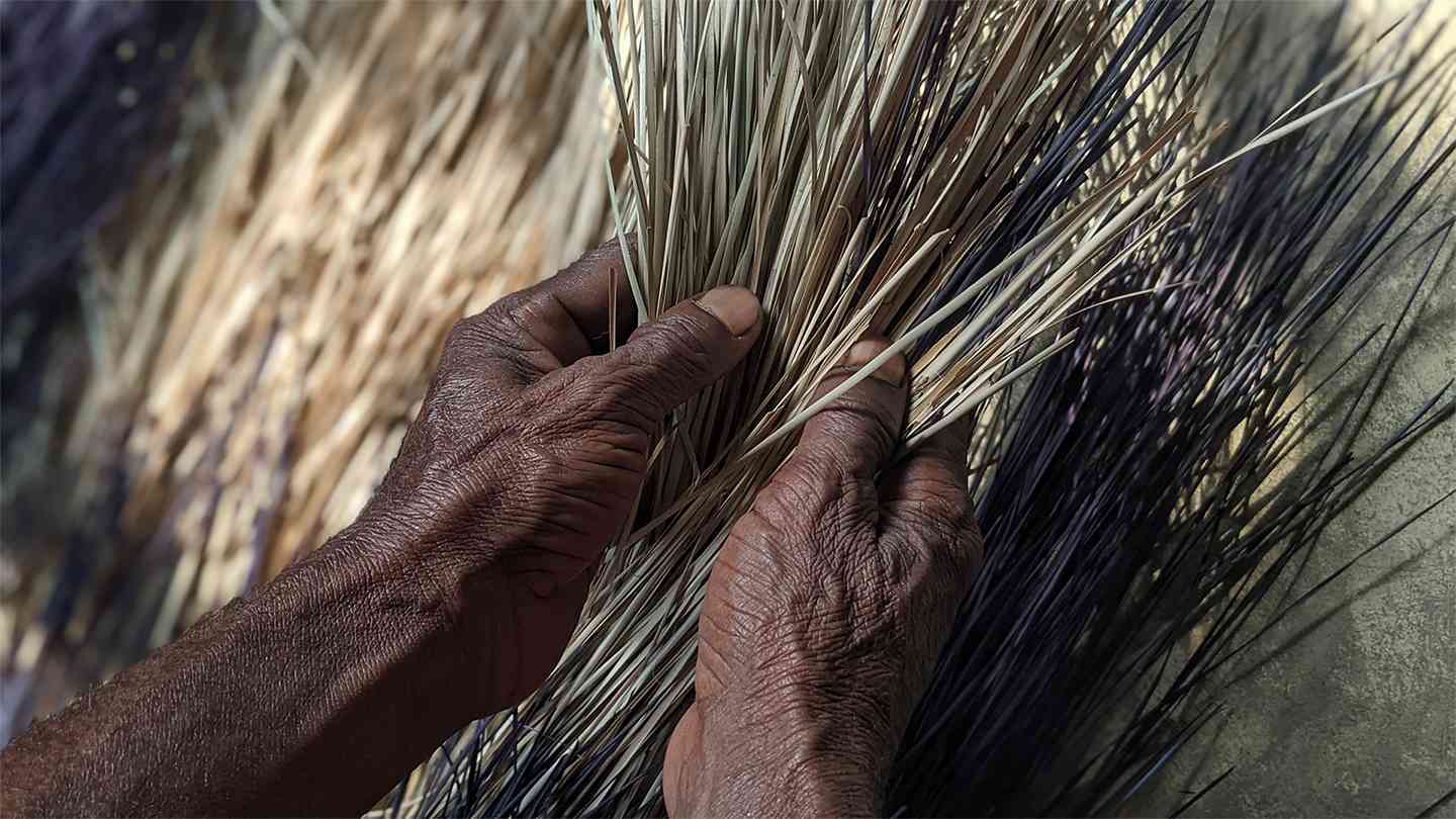 mats by weaving together strips of green cane known as murta. These mats are