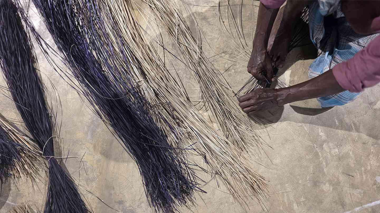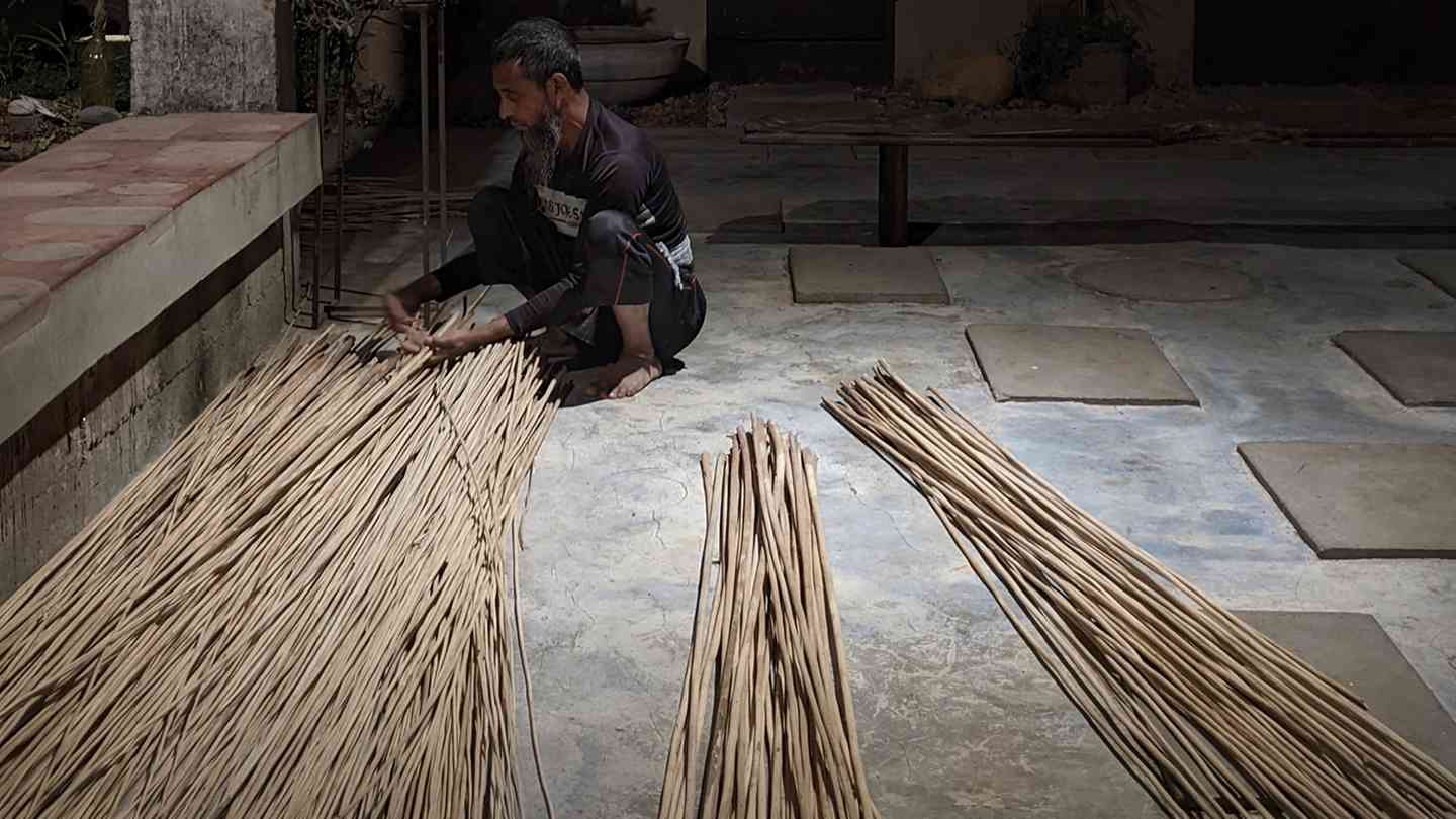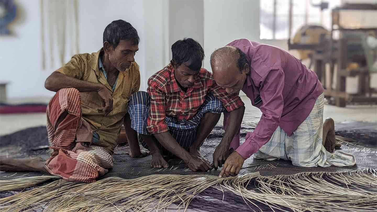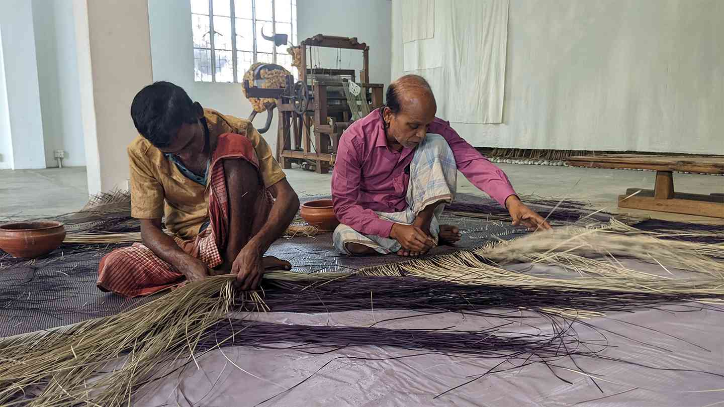 শীতলপাটি / Shitalpati is the traditional art of making handcrafted mats by weaving together strips of green cane known as murta. These mats are used across Bangladesh as sitting mats, bedspreads, or prayer mats. The primary bearers and practitioners of this craft are weavers living mostly in the low-lying villages of the greater Sylhet region, although pockets of shitalpati weavers exist in other parts of the country. Shitalpati weaving is not only a major source of livelihood but also a strong marker of cultural identity. Primarily a family-based craft, it reinforces familial bonds and fosters a harmonious social atmosphere. The Shitalpati rests as a circle—a bindu, the point of origin—woven by artisans-in-residence Horendro Kumar Das, Gobinda Kumar Das, and Shottendro Kumar Das under the creative direction of Bishwajit Goswami.